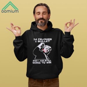 - With the words “34 Felonies 1 Bullet And I Am Still Going To Win” printed on the shirt, this product represents determination and aspiration to overcome all challenges. The combination of the number of crimes and the statement “I Am Still Going To Win” makes a strong statement of resilience and determination.