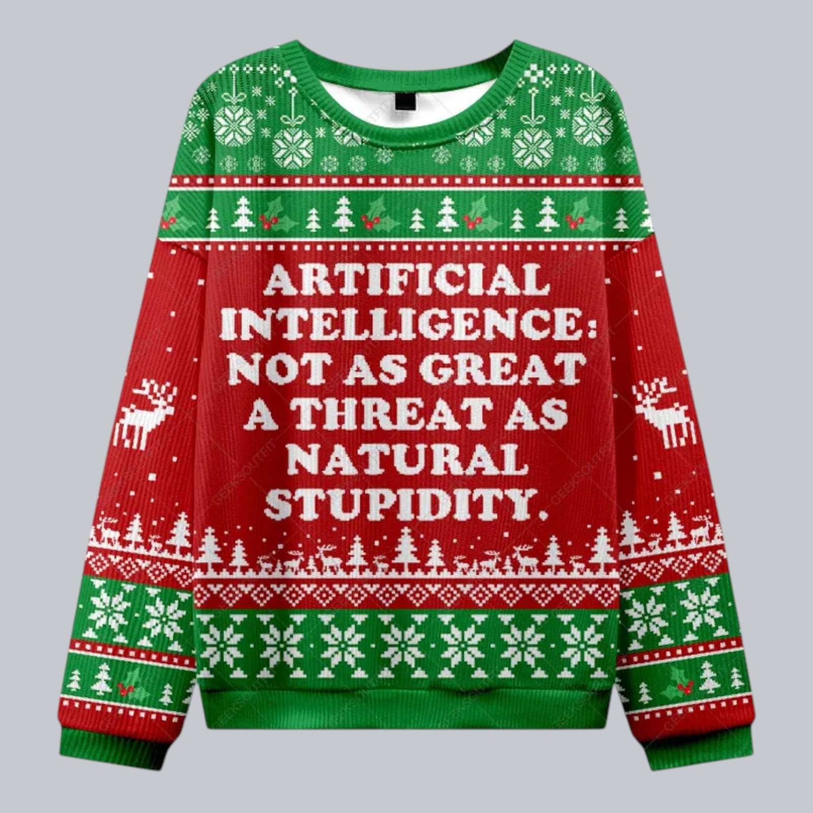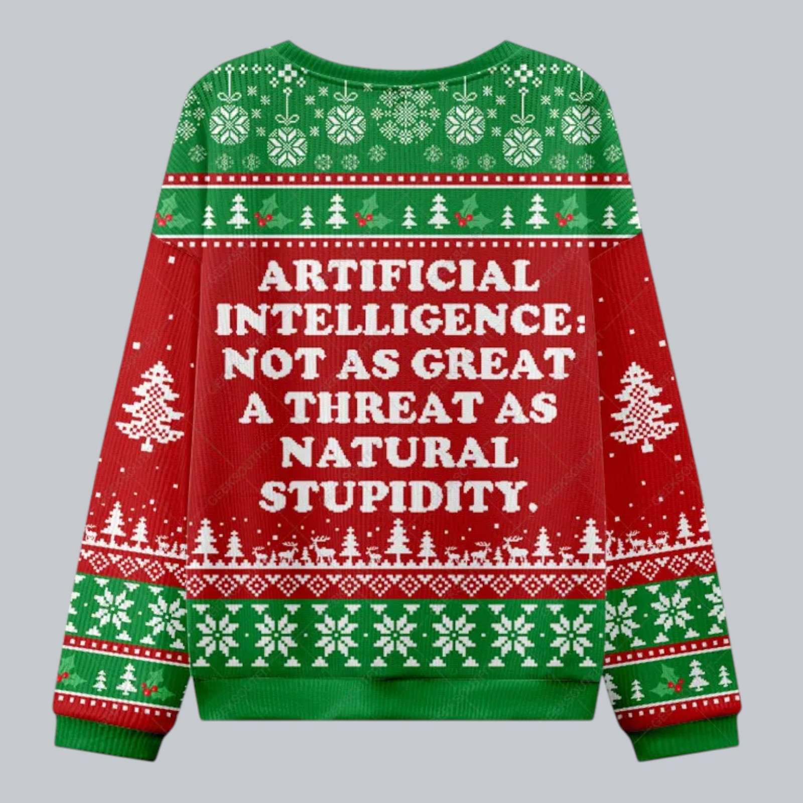 This sweater captures the ugly sweater spirit with its traditional Red and Green color combination, accented with classic Christmas motifs. The sleeves, collar, and bottom hem are decorated with Christmas trees, snowflakes, and white reindeer in a signature knit-style. The central accent is bold, easy-to-read, white lettering: ARTIFICIAL INTELLIGENCE: NOT AS GREAT A THREAT AS NATURAL STUPIDITY. The hem across the chest and abdomen is adorned with alternating pine branches and holly berries.