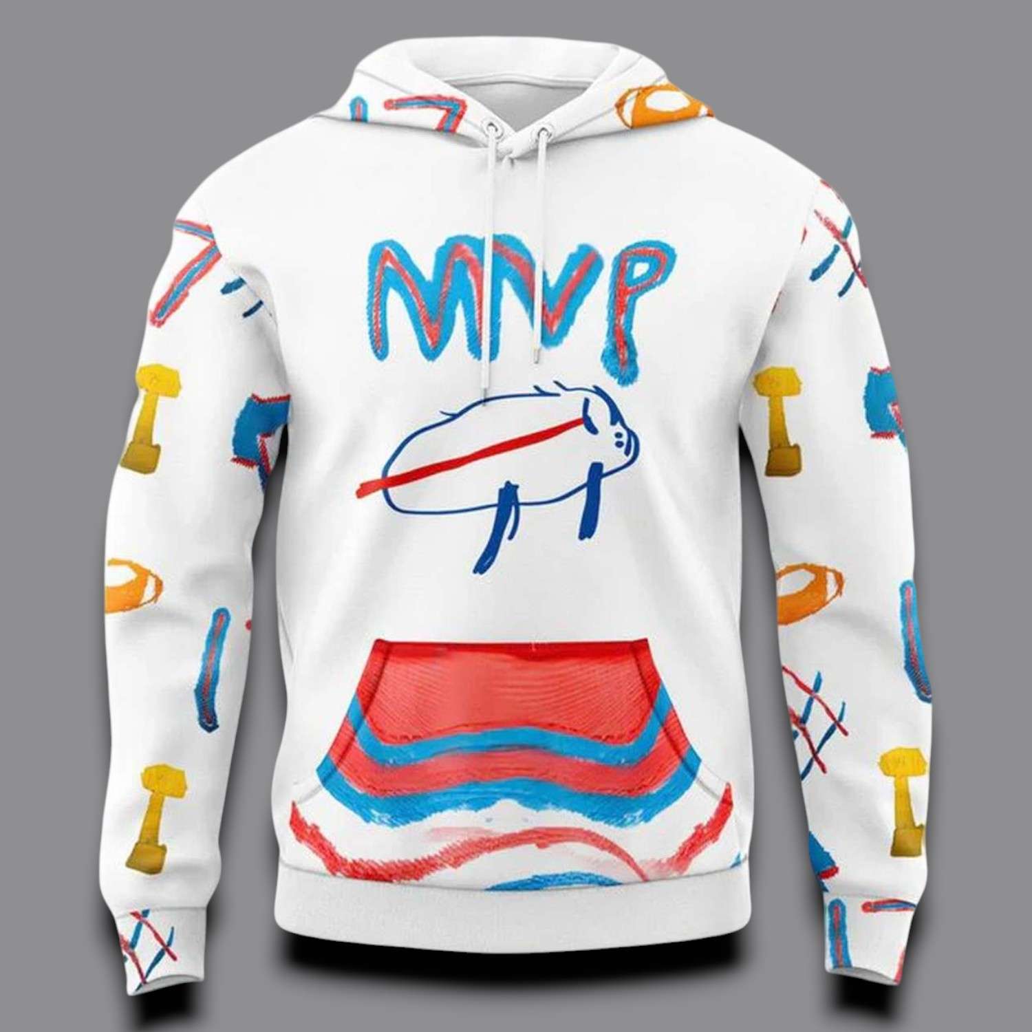 - Unique Front: The central MVP lettering is painted in a brush-style blue and red, followed by a simple, playful yet fast and powerful Bills mascot sketch. The front kangaroo pocket is adorned with horizontal red and blue lines, simulating rough yet harmonious strokes, attracting all eyes.