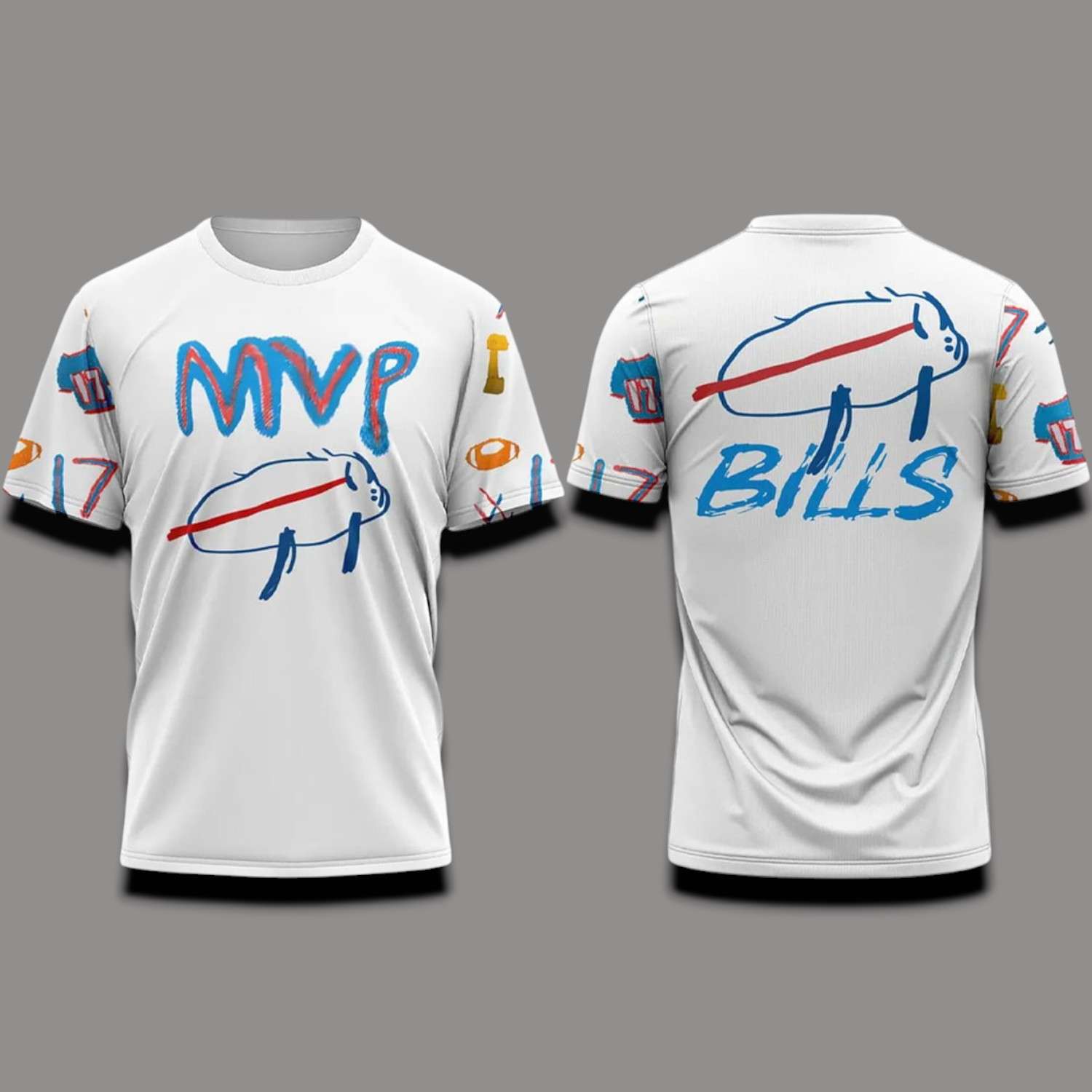 - Striking Front: The MVP text is written in blue and orange-red brush strokes in the center, expressing the strong belief in Josh Allen’s MVP title. Below is a simple, playful sketch of a buffalo (the Bills’ symbol), with a red dash running through it, creating a unique and humorous mark. Surrounded by small details like the number 17 and the image of a football, the Bills flag, in the background.
