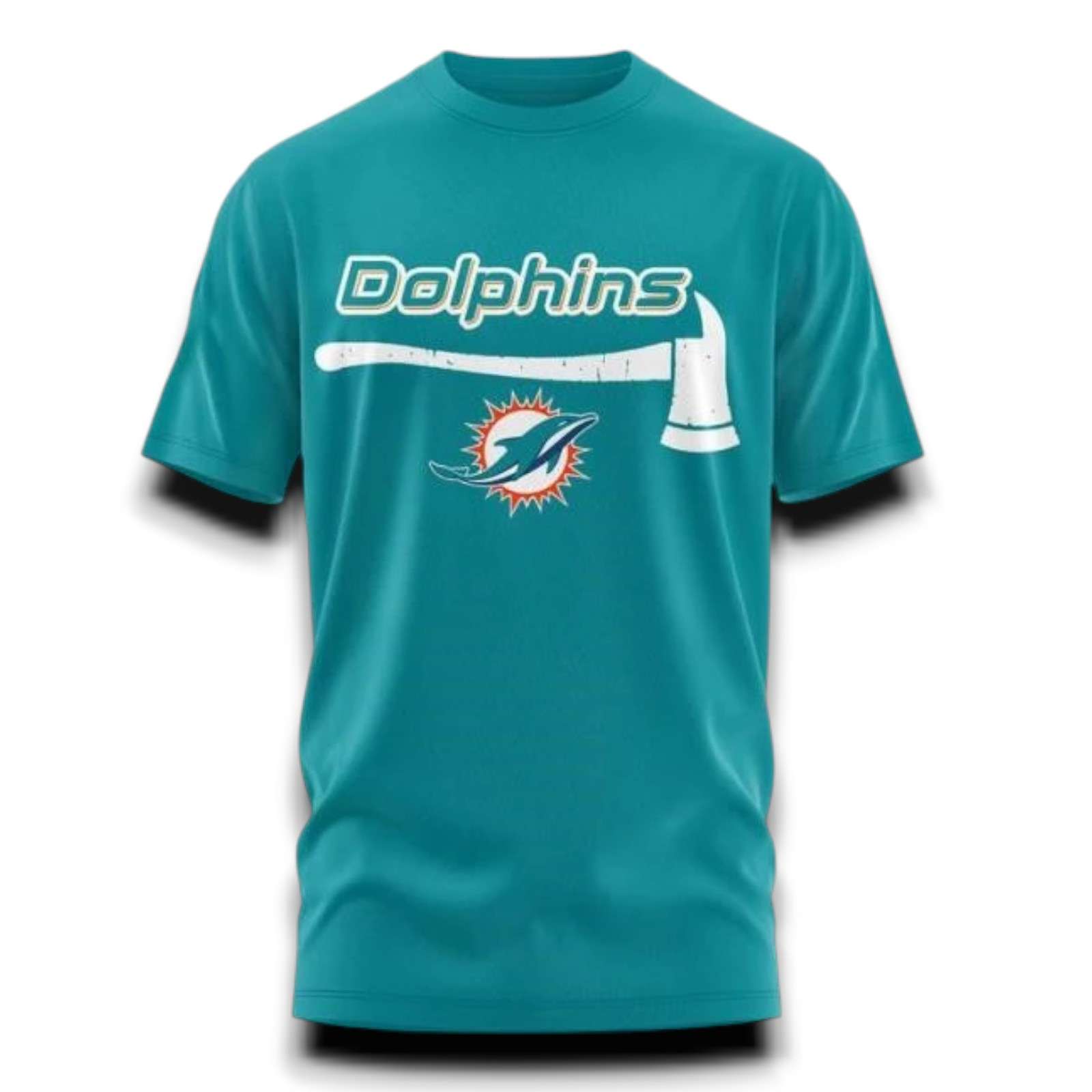 - Front: Featuring the Dolphins football team name and the famous dolphin placed on a large white fire axe. This design harmoniously combines the sports symbol and the tools associated with the work of firefighters, representing strength and resilience.