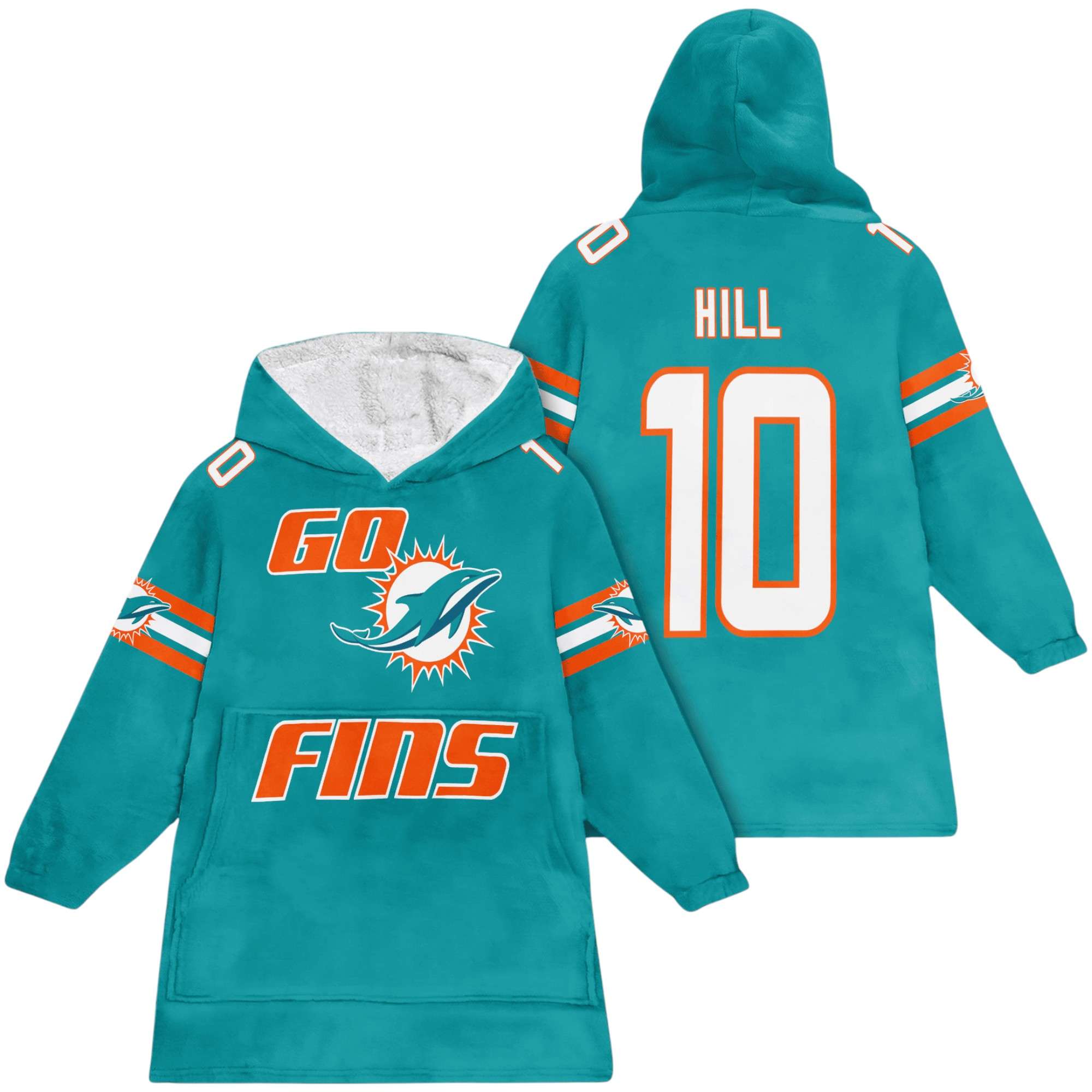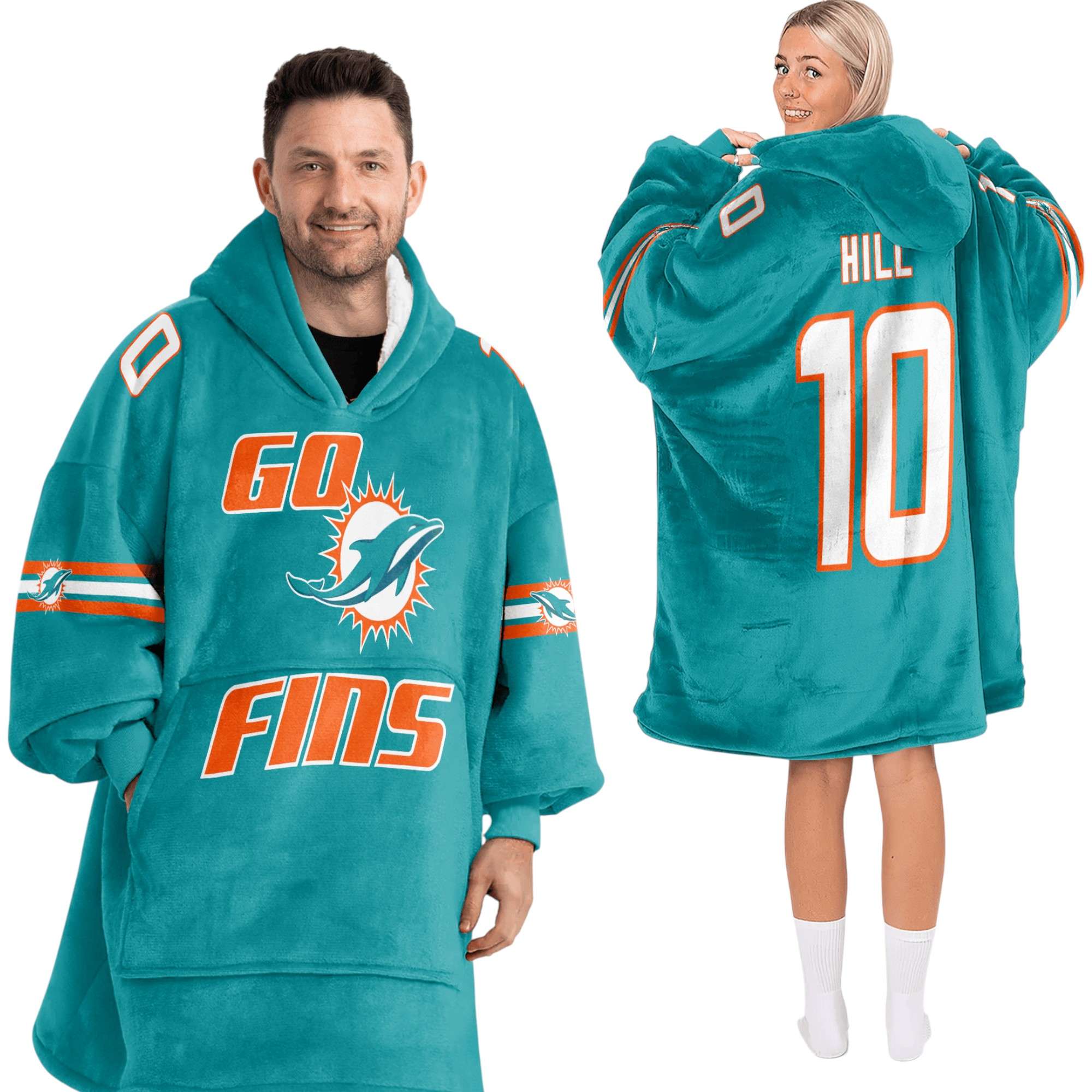 Welcome to the perfect combination of passionate football cheering style and ultimate comfort! The Dolphins Go Fins Hill 10 Football Unisex Blanket Hoodie is not only a piece of clothing to keep you warm but also a statement of personality for Dolphins fans, especially those who love the star number 10, Tyreek Hill. Let’s explore the details of this unique product.
