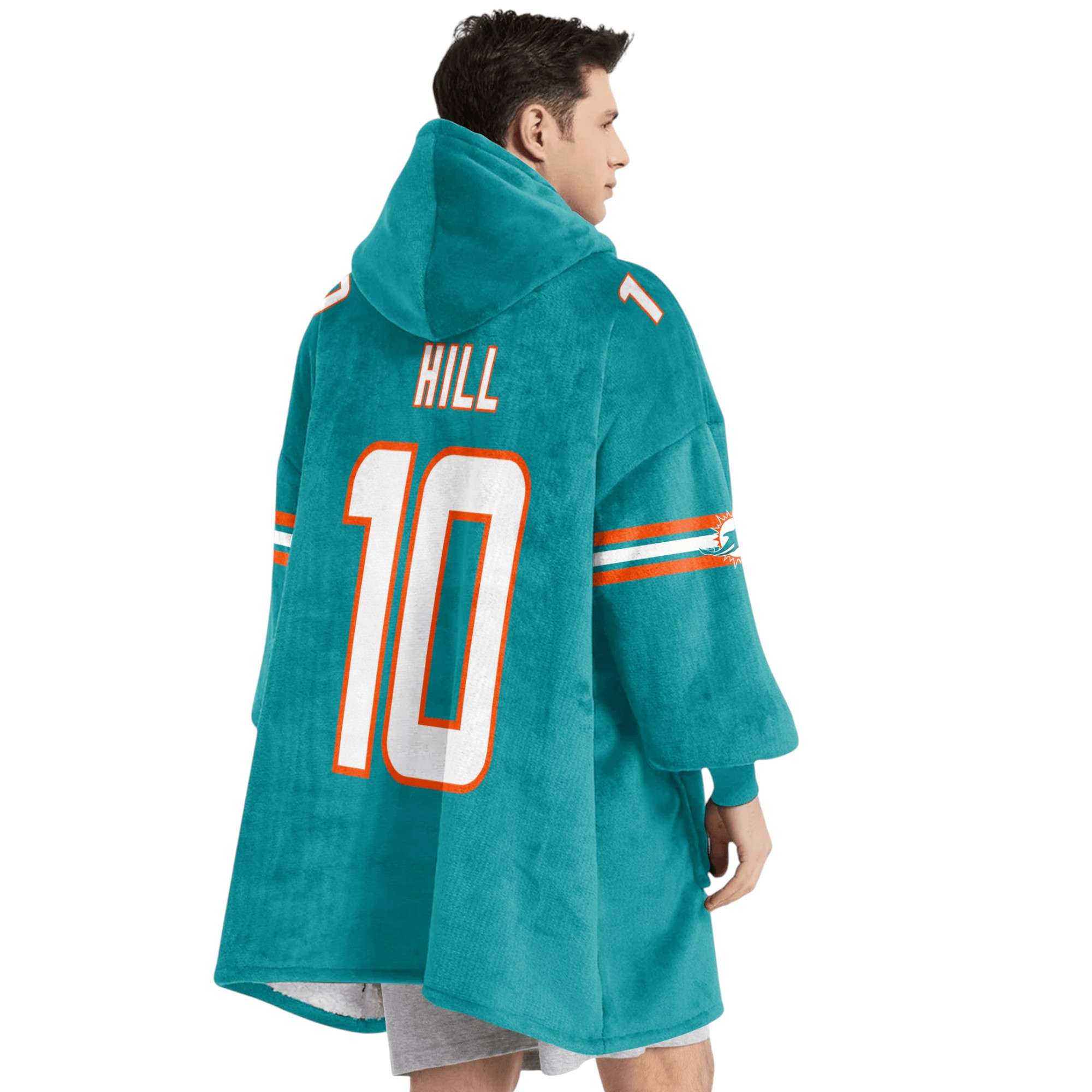 - The back features a star-studded tribute: the name HILL and the number 10, paying tribute to Tyreek Hill’s speed and talent. This design transforms into a super cozy blanket hoodie, allowing fans to show off their pride for their favorite player in the most comfortable and cozy way, perfect for relaxing football nights.