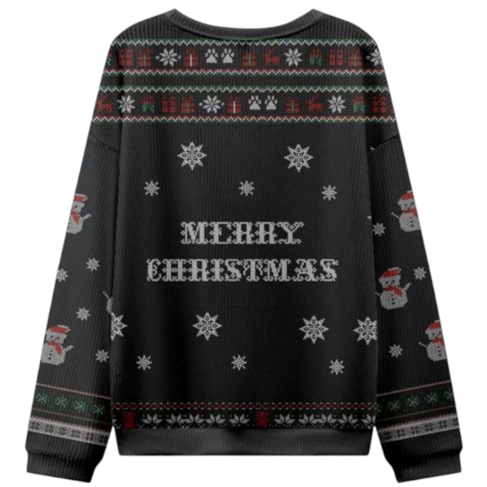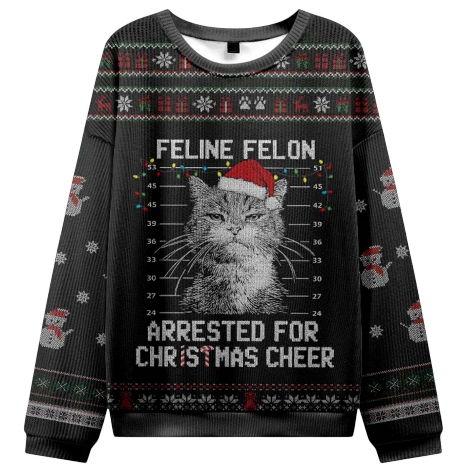 The central image is placed in front of a height gauge, along with the statement of the crime as Feline Felon and the reason for arrest as Arrested For Christmas Cheer. The design is surrounded by faux knitted holiday motifs such as Christmas lights, snowmen, snowflakes, and a red-green checkered pattern on the hem. The back is a black background with embossed MERRY CHRISTMAS, accented with snowflakes, snowmen, and cat paw prints sophisticated, creating a unique and amusing festive fashion statement.