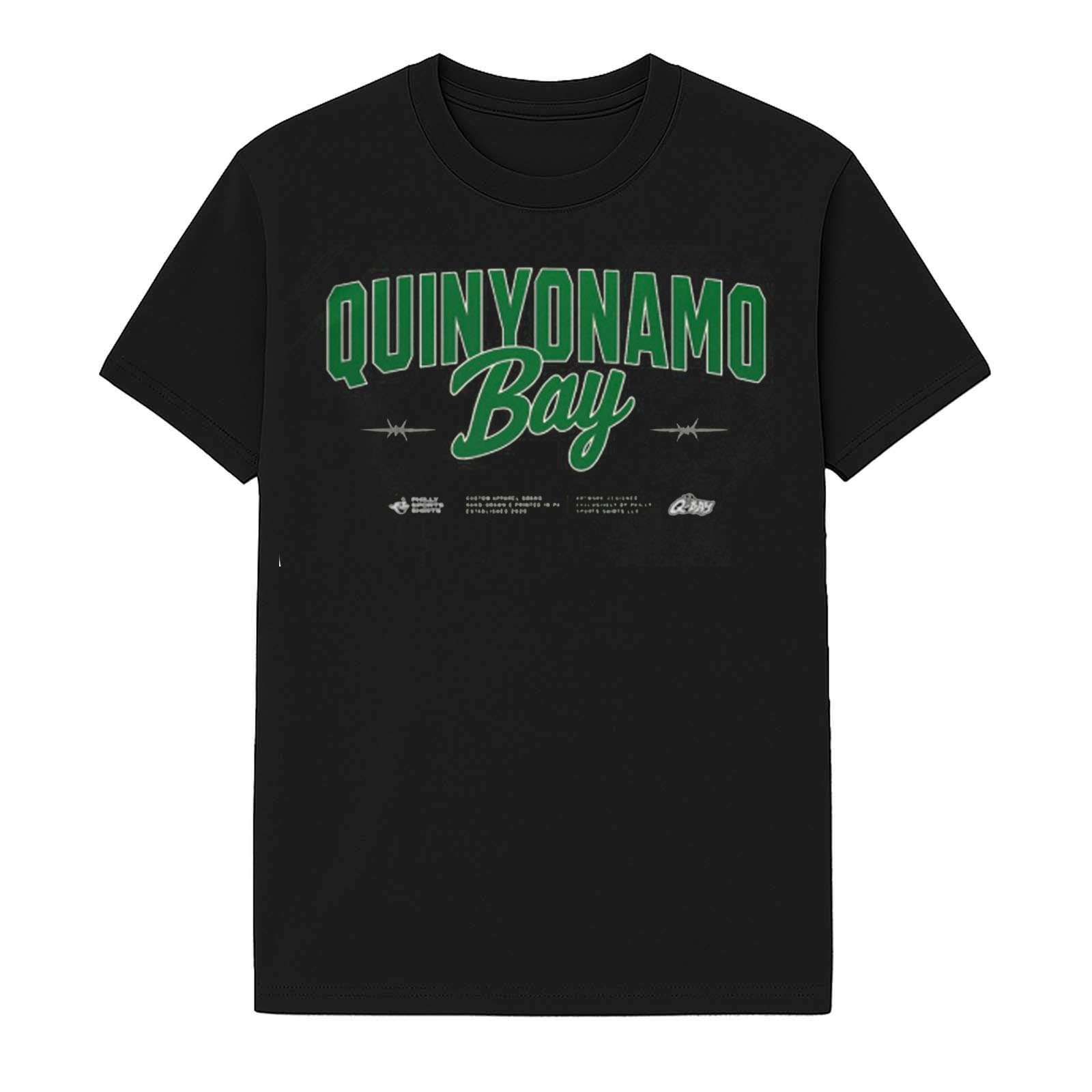 The Hoodie’s central image is of an Eagles player wearing the number 2 jersey (Jalen Hurts), squatting in a powerful warrior pose, clutching the football. The sharp graphic design on the back places the player in a dark, powerful bay scene, with a vibrant green lightning bolt and imposing bridge pillars, exuding danger and uncompromising fighting spirit. The phrase QUINONAMO BAY is used as a powerful slogan, implying a place of challenge that requires focus, iron discipline, and the unyielding will of a true warrior—a reflection of Hurts’ style of play. The minimalist front, with QUINONAMO BAY on the chest, makes this black hoodie the perfect blend of streetwear and passionate Eagles support.