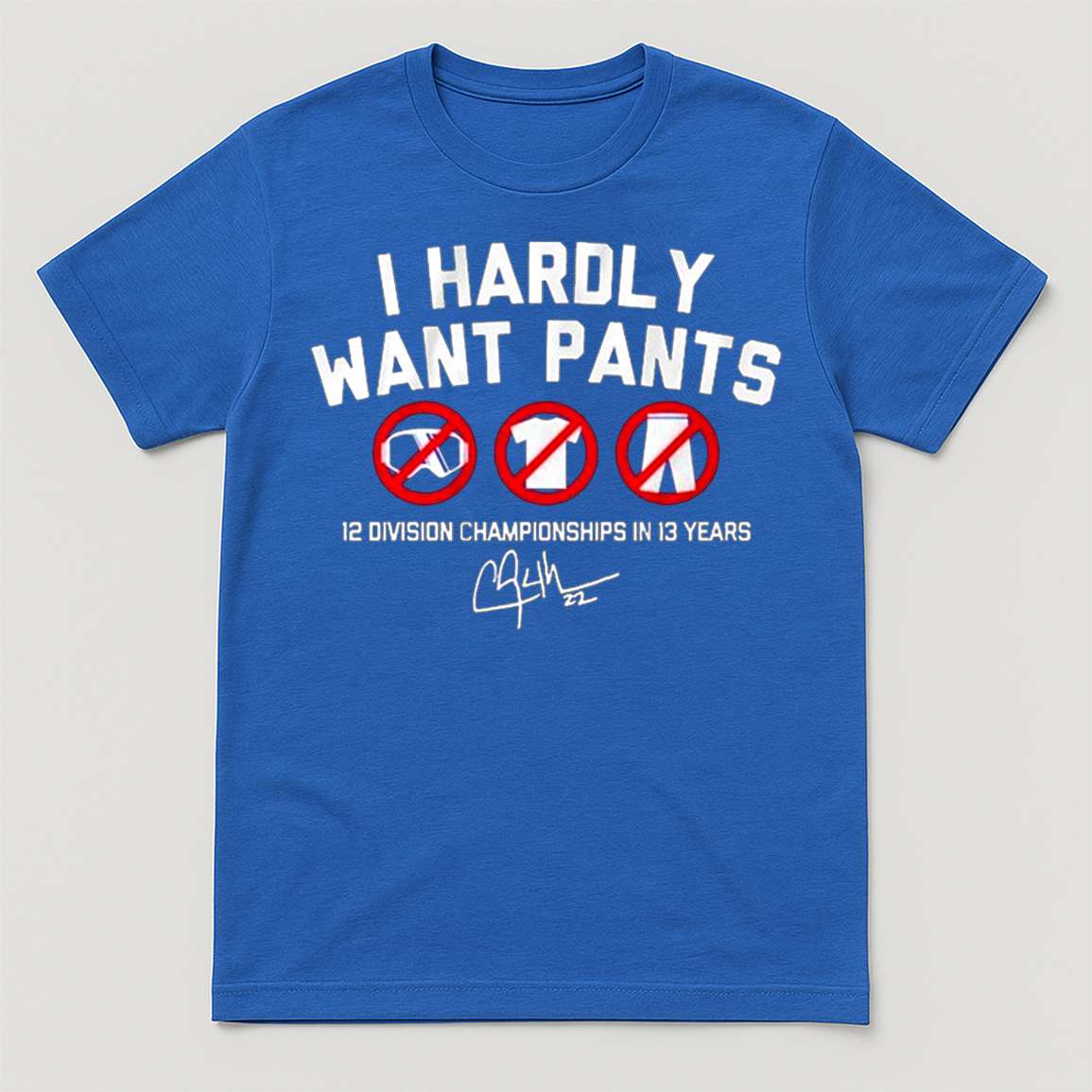 The vibrant blue shirt worn by Kike Hernandez offers the perfect blend of humor and sports pride. The bold I HARDLY WANT PANTS text, paired with a cross-hatched image of three different pants, conveys a relaxed, carefree, and free spirit after intense moments of battle. Just below, you’ll find the mark of a legacy: 12 DIVISION CHAMPIONSHIPS IN 13 YEARS. This number represents the team’s absolute, unbroken dominance for a decade and a half, a testament to relentless excellence.