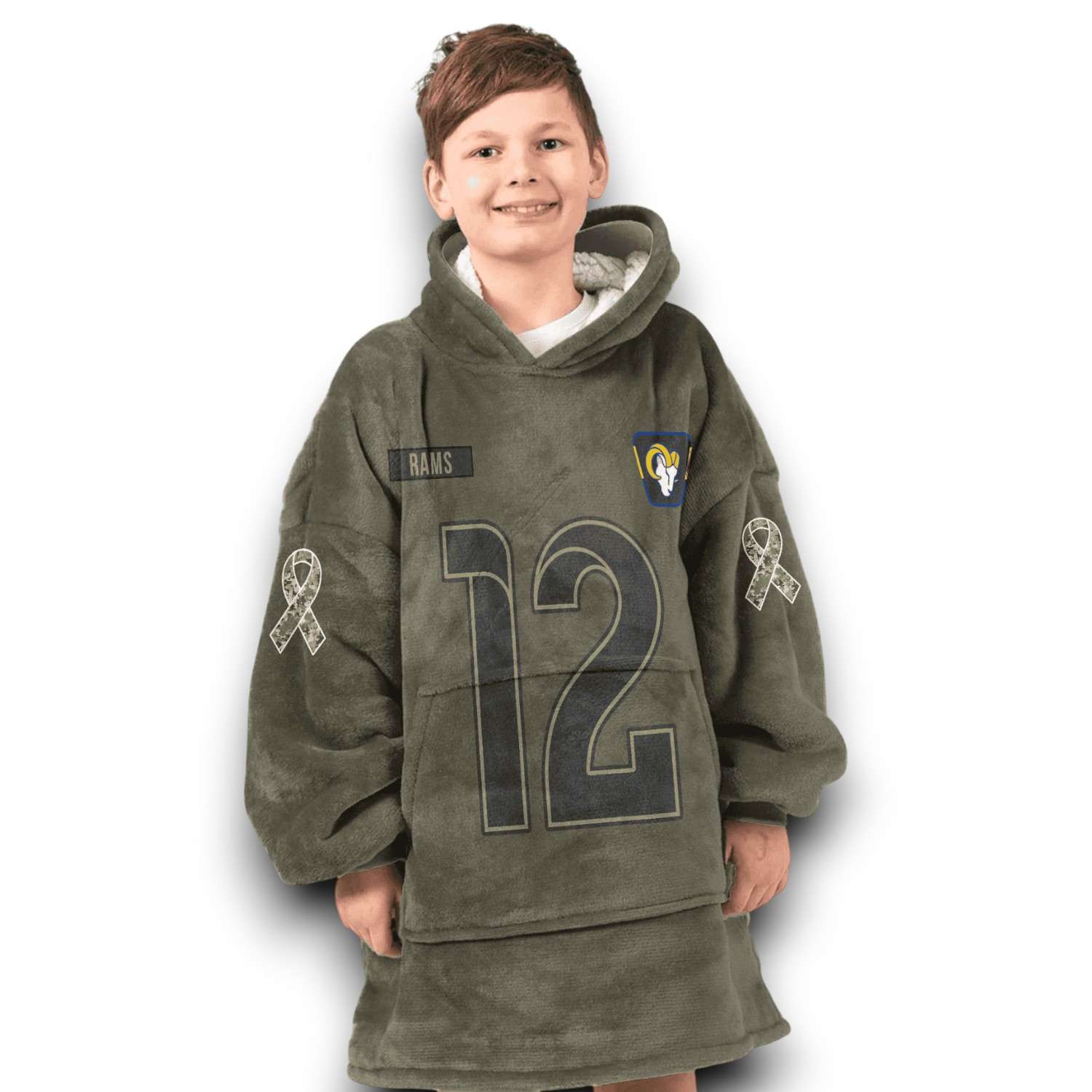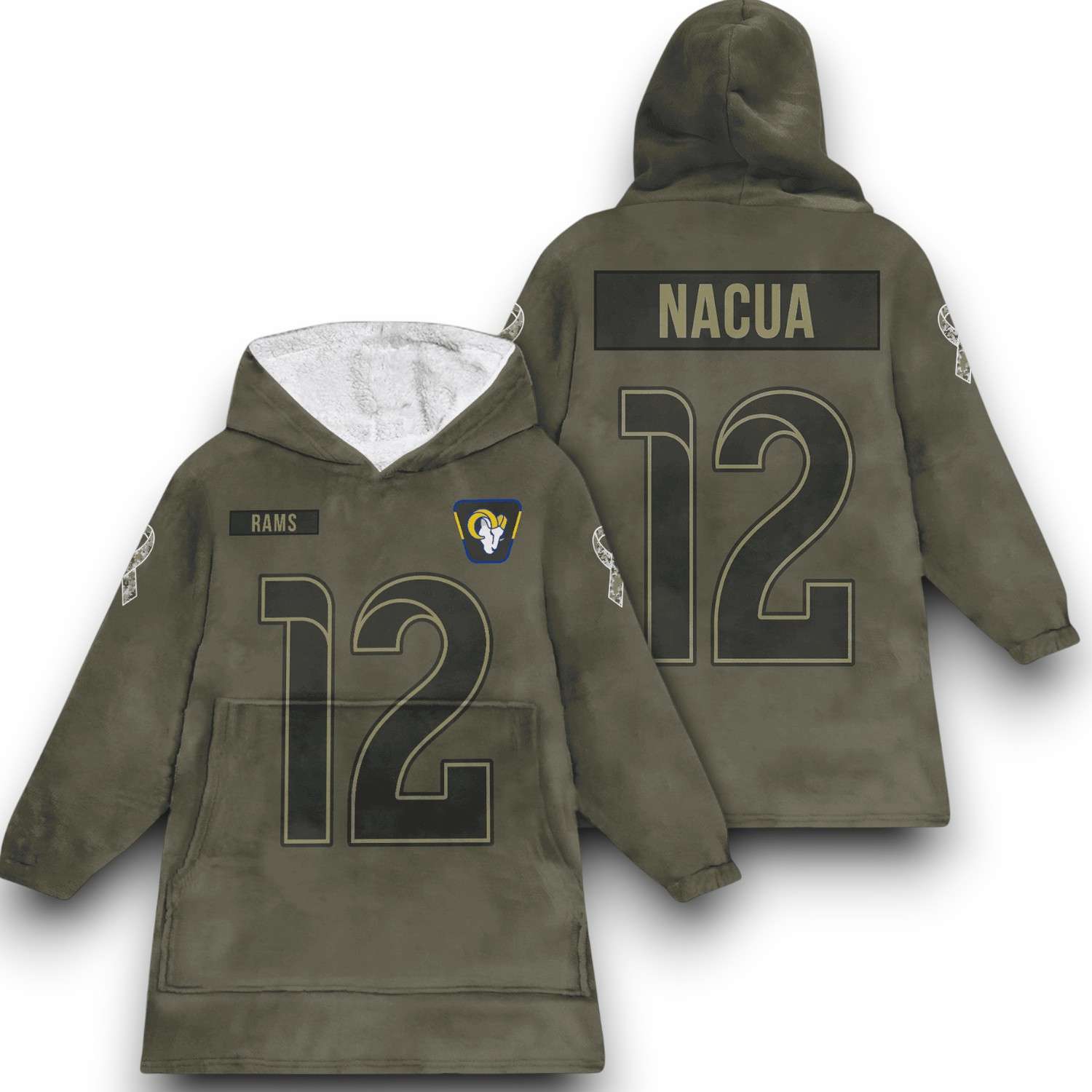 Enjoy The Warmth Of Team Spirit With The LA Rams Nacua 12 Olive Salute To Service Football Blanket Hoodie