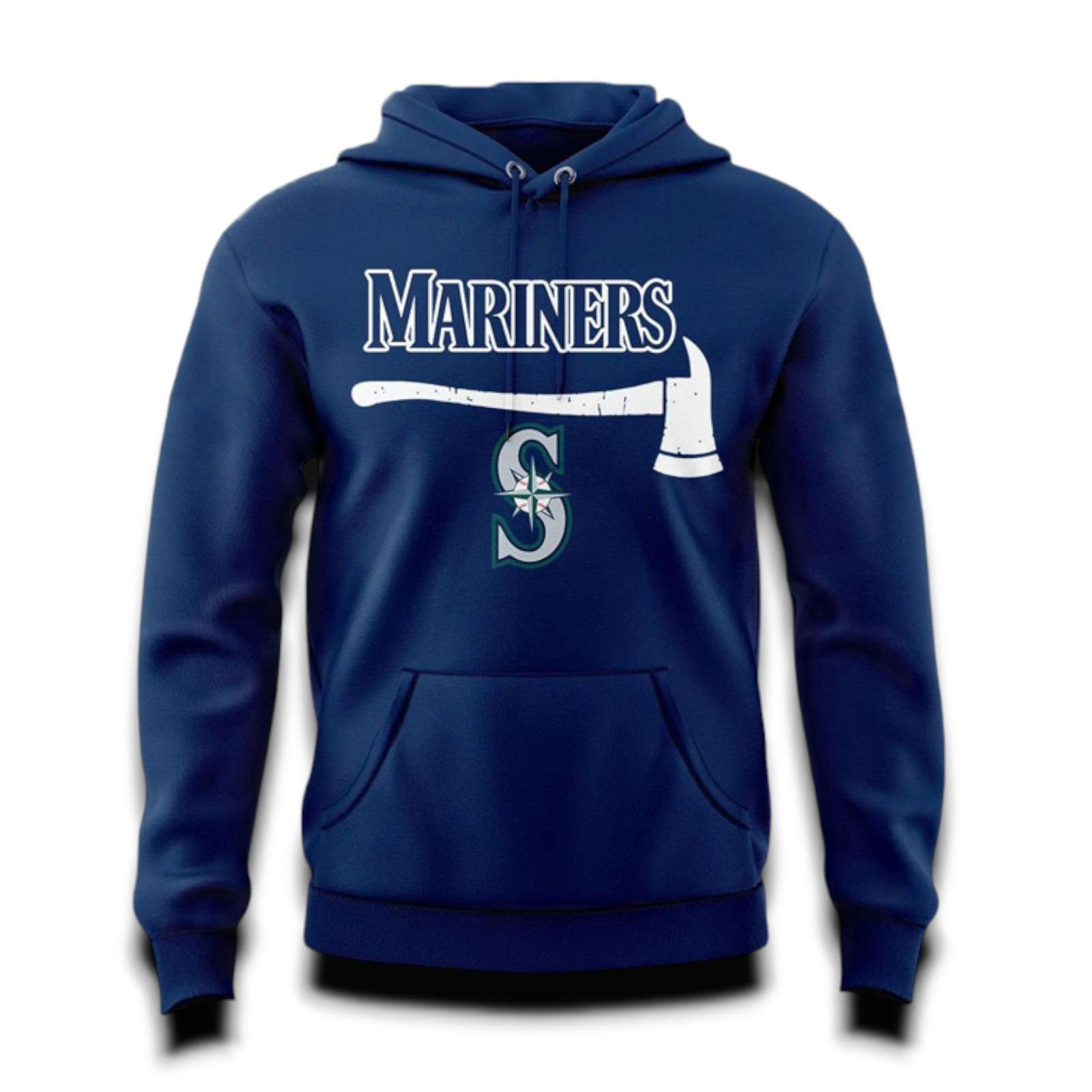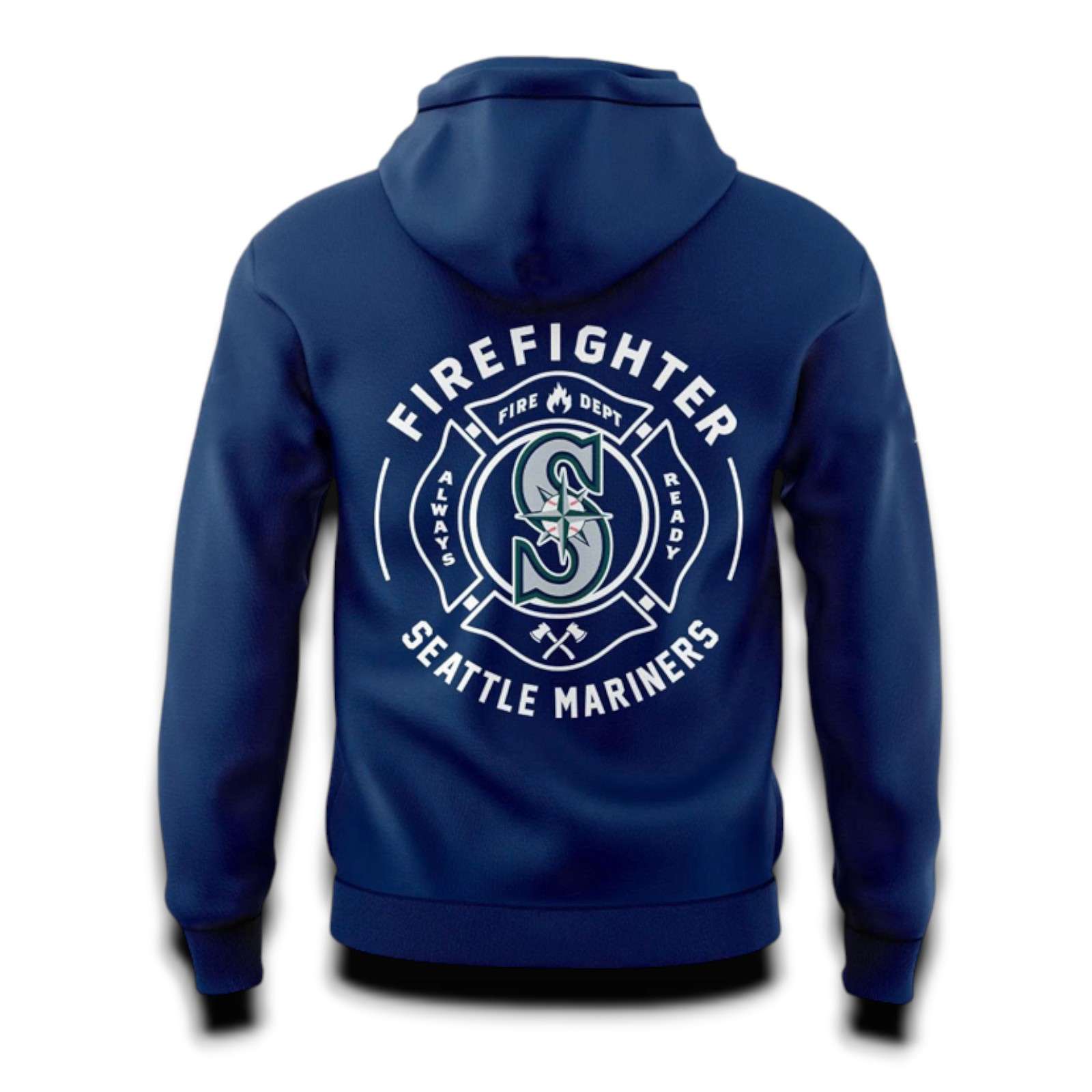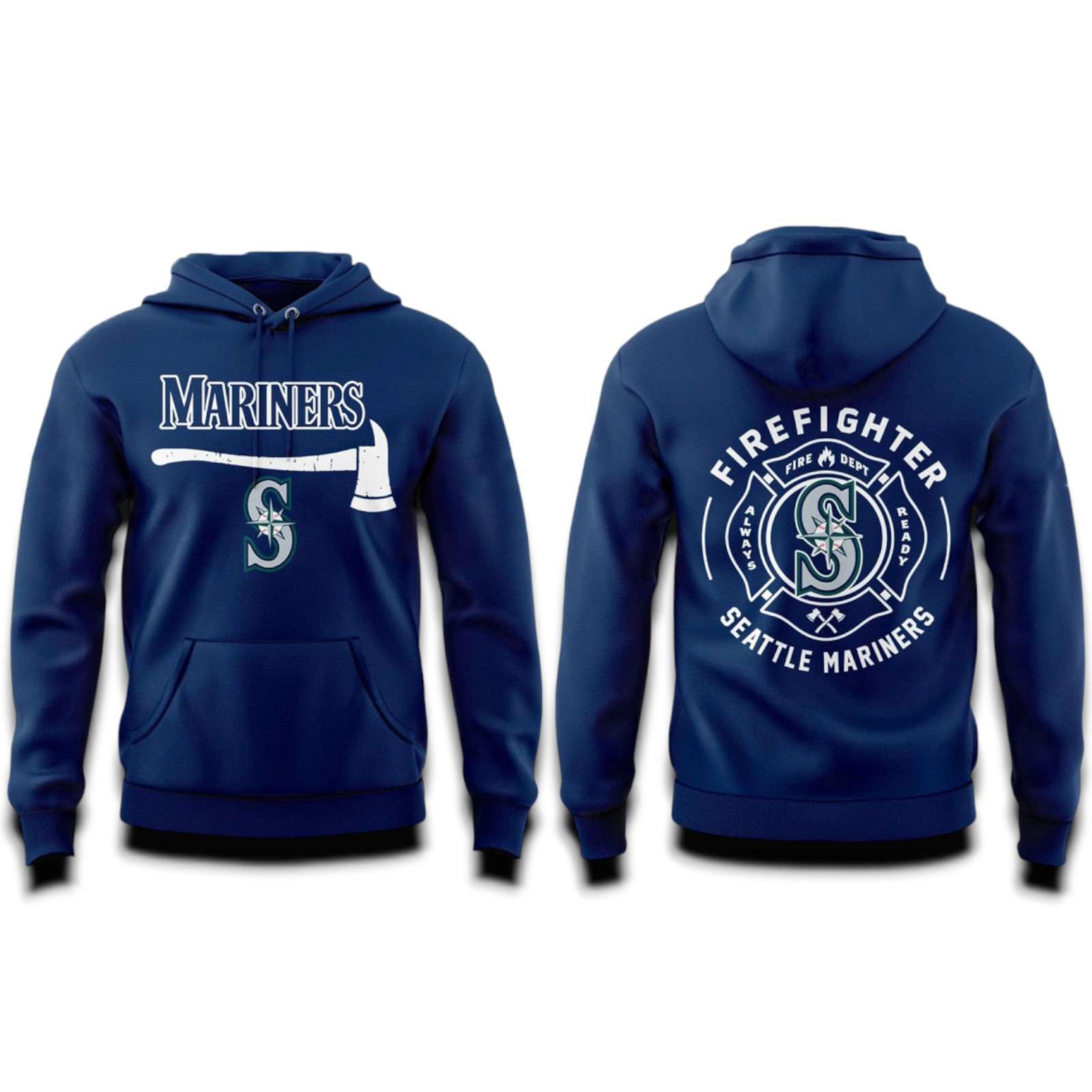 The front of the hoodie features a large MARINERS lettering, below which is a fire axe blade placed diagonally, overlapping the legendary S of the team. This combination conveys strength, readiness and fighting spirit – both as a passionate fan and a hero on the front lines. The back is the center of the tribute, with large FIREFIGHTER lettering and a detailed circular fire emblem, including the words FIRE, DEPT, RESCUE, and ALWAYS READY. In the middle is a stylized Mariners. At the bottom is the word MARINERS, affirming the pride and strong connection to the Seattle community. This design clearly shows respect for the heroes of the fire department.