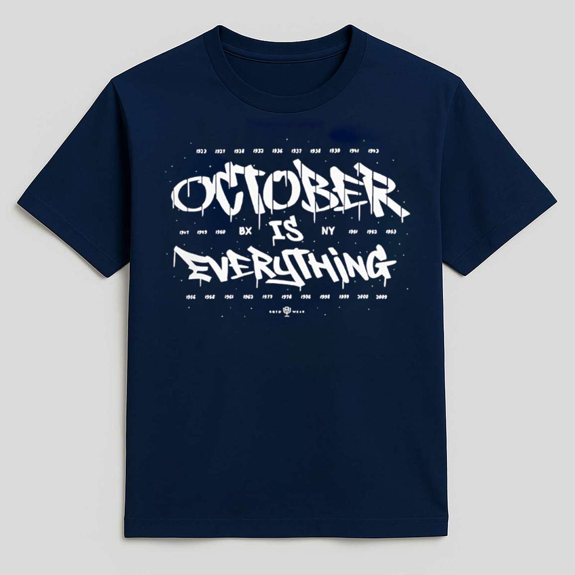 The shirt features a Dark Navy background, a classic and classy color, creating a perfect backdrop for the core message. The main highlight is the OCTOBER IS EVERYTHING text expressed in white Graffiti/Spray Paint style. The letters are spray-painted in a spontaneous and powerful way, creating a sense of wildness, uncontrollability and bold street spirit. Above and below the main slogan are smaller, faded letters that add depth to the design without taking away from the central message.