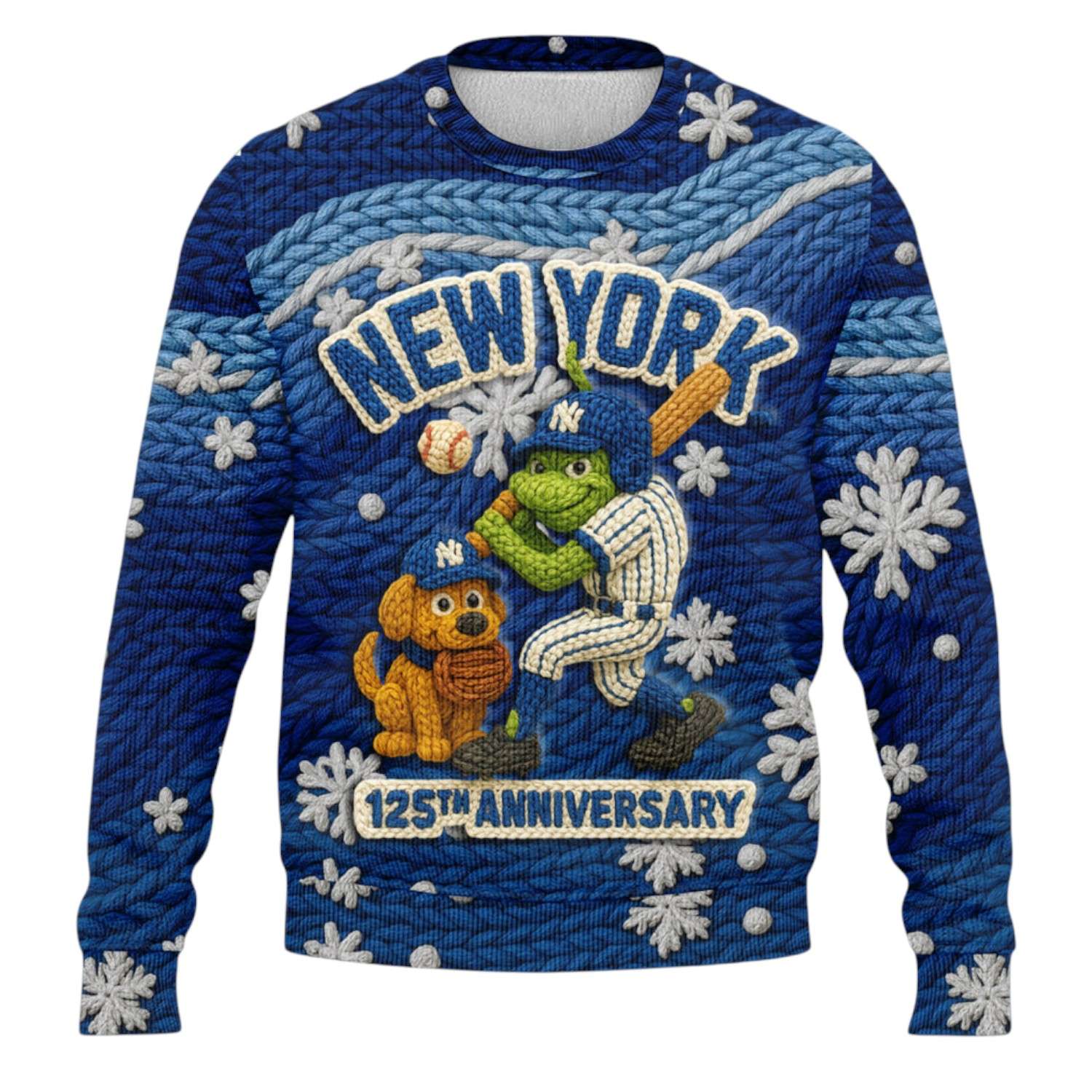 - Vivid Front: The focal point is a depiction of the Grnch in Yankees gear, holding a baseball bat, standing next to his adorable dog, Max, also wearing a Yankees cap. Both are designed in a 3D knitted design, giving them depth and texture. The top features the bold knitted words NEW YORK, and the bottom features the all-important 125TH ANNIVERSARY.