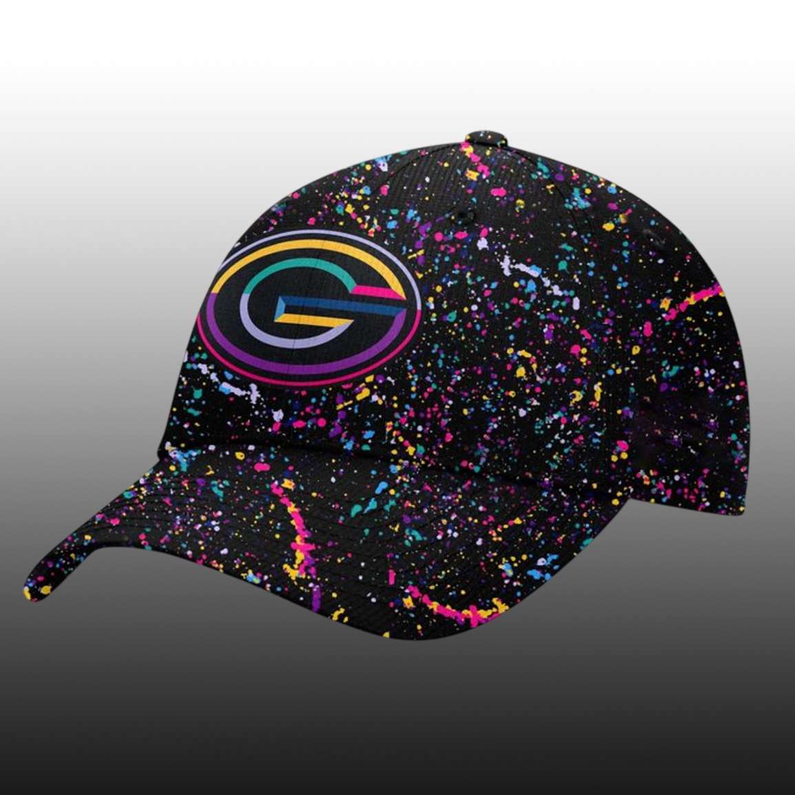The eye-catching design is the energetic and personality paint splatter design on the pure black fabric. Bright neon colors such as hot pink, lime yellow, turquoise and electric purple dance randomly, reminiscent of the vibrant 90s. The most important part is the G placed in the center front. This is the perfect combination of Packers pride and philanthropy.