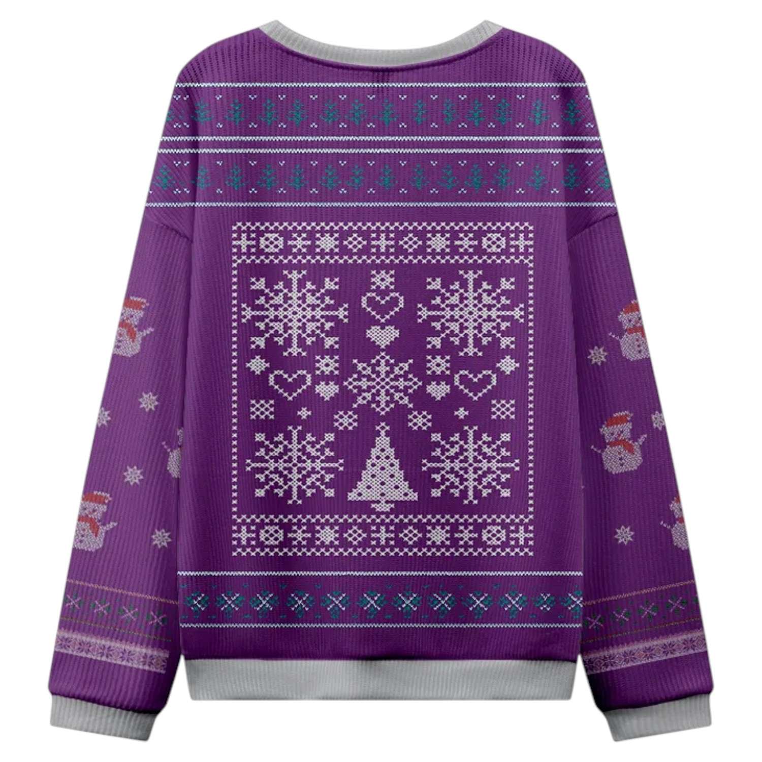 - Color & Style: The sweater comes in a variety of basic color options (e.g. green/white, purple, black, blue) combined with classic Christmas motifs such as pine trees, snowflakes and snowmen, creating a fun contrast between tradition and modern irony.