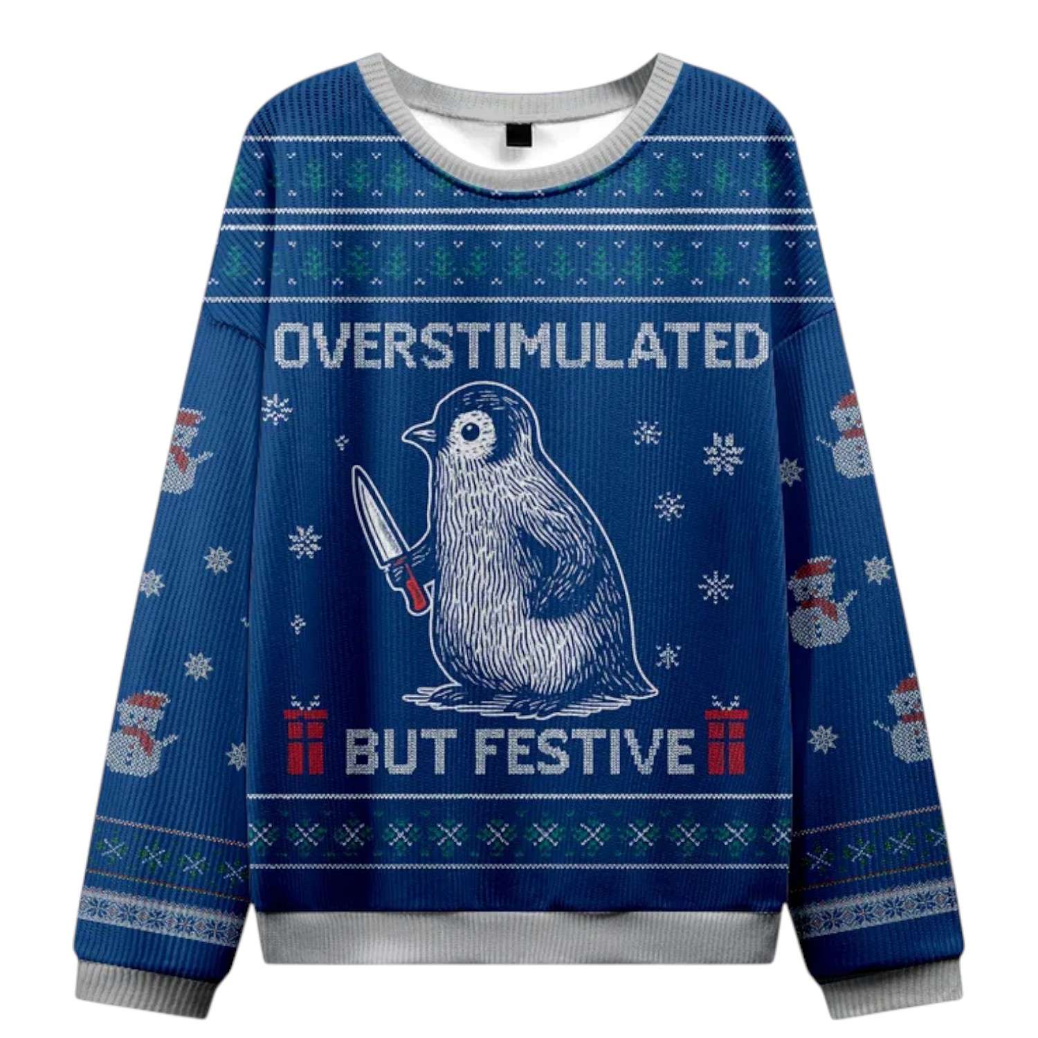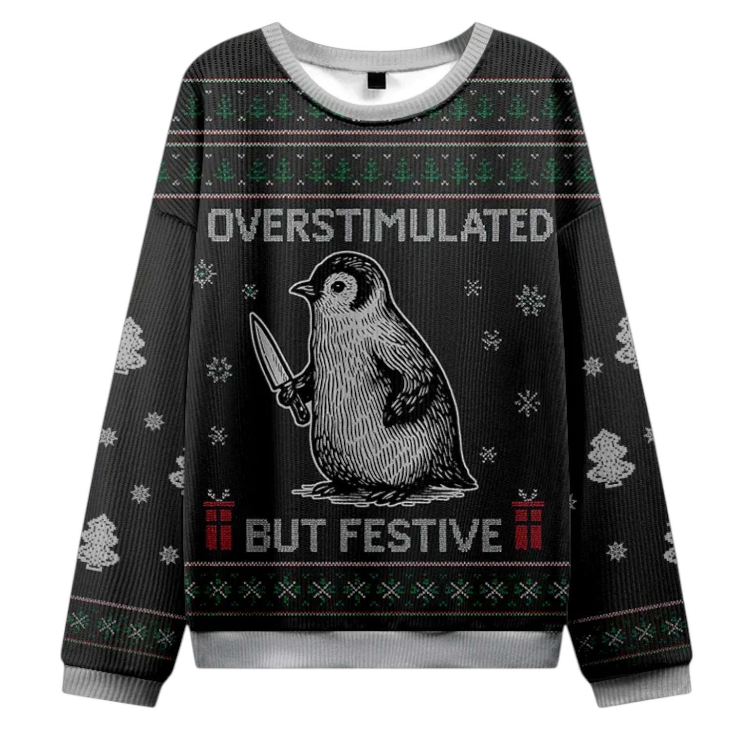 Penguin Overstimulated But Festive Christmas Ugly Sweater That’s Exactly How You’re Feeling
