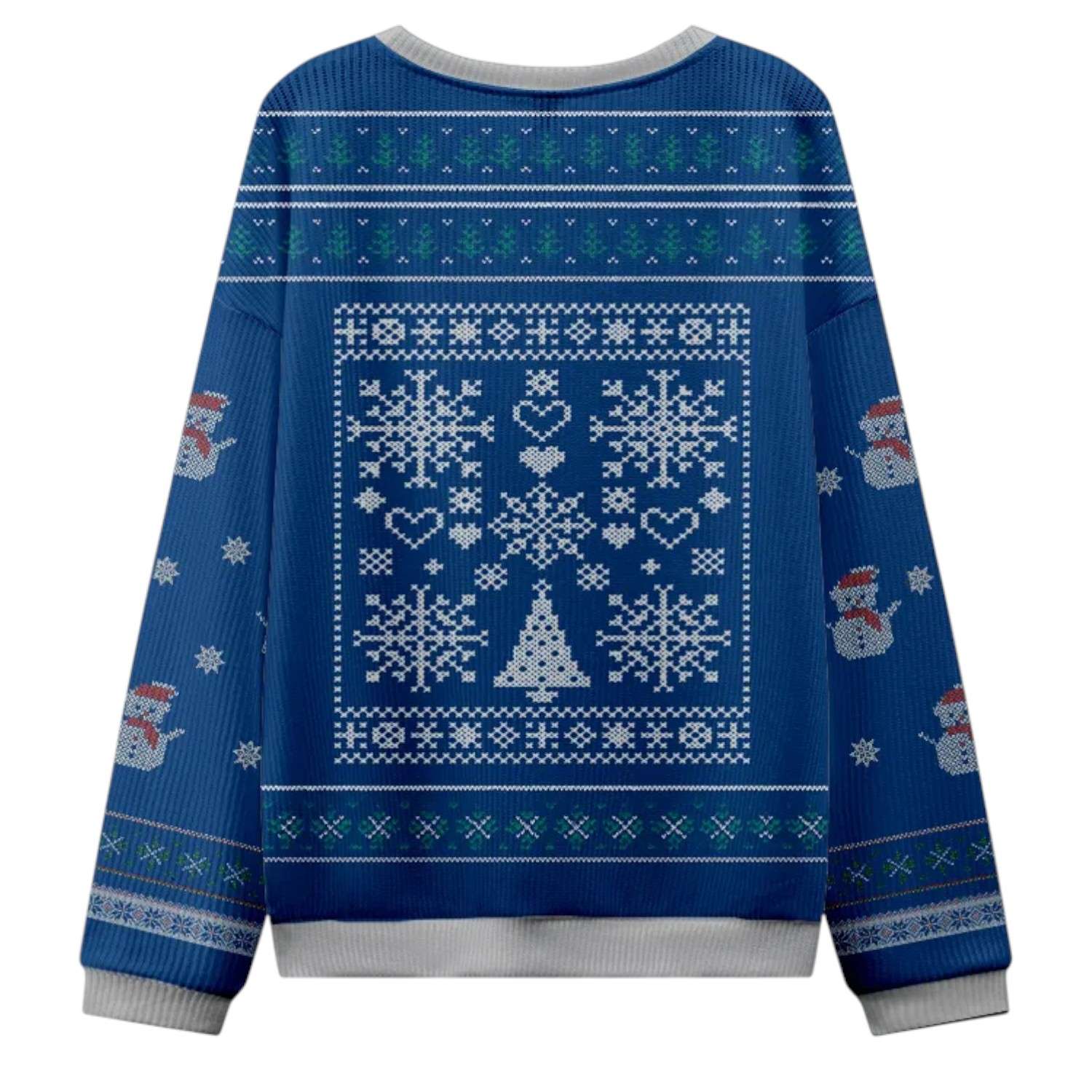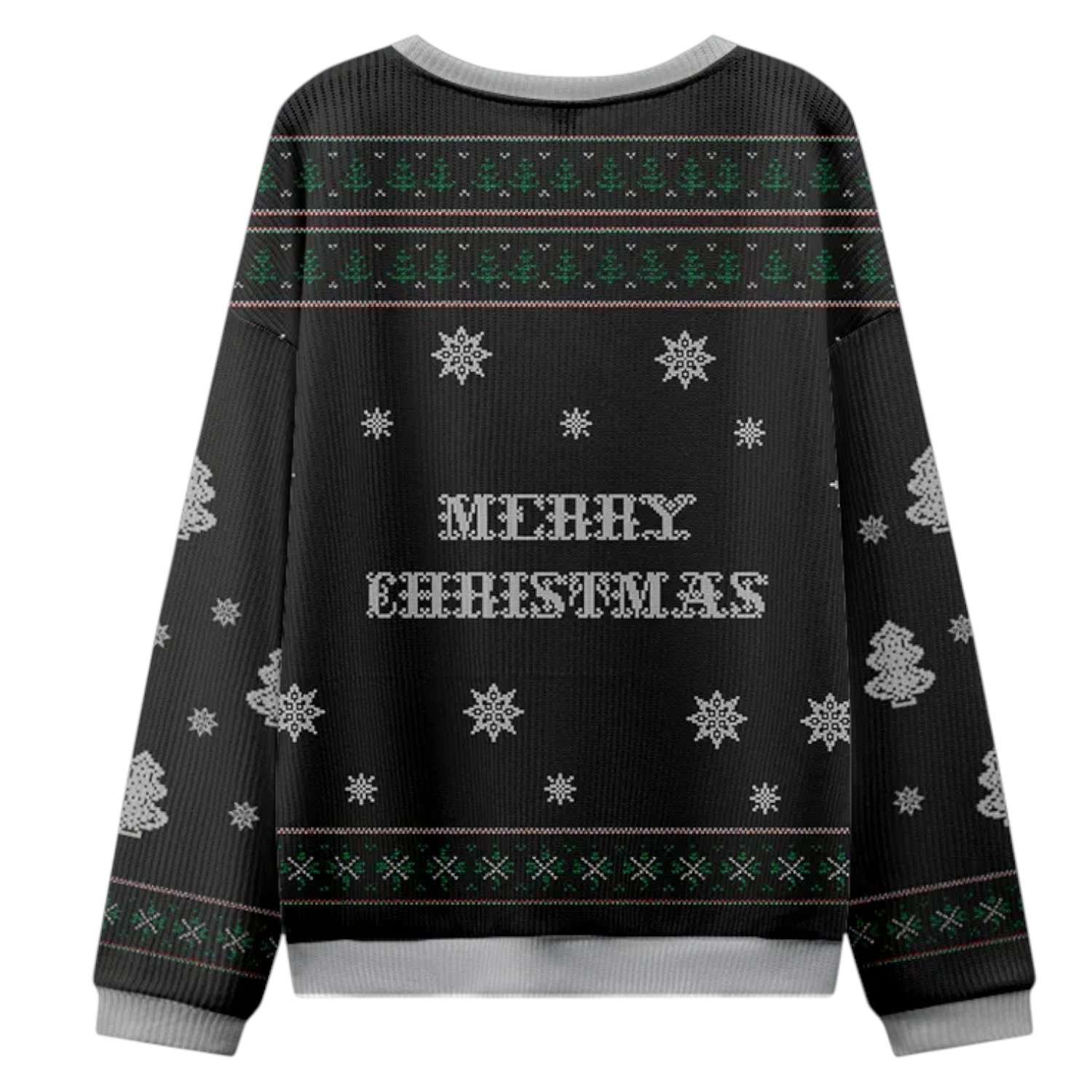 - Back: The back of the sweater features rich, classic winter knit motifs such as large snowflakes, small pine trees and hearts, maintaining the warm, traditional feel of a Christmas sweater. Some black versions even feature a bold MERRY CHRISTMAS print.