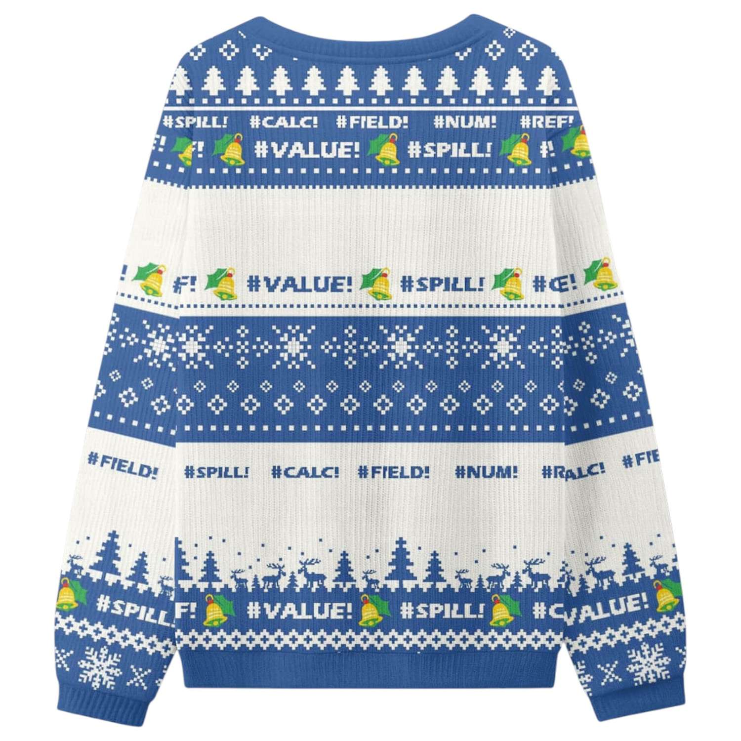 Imagine a bustling Christmas season without forgetting the familiar headaches in the office – that is the inspiration to create Put It In A Doc Please Ugly Christmas Sweater. With a striking blue-white tone, the sweater is covered with traditional motifs such as pine trees, snowflakes, reindeer combined with a series of familiar Excel errors: #VALUE! #SPILL! #CALC! #REF!.