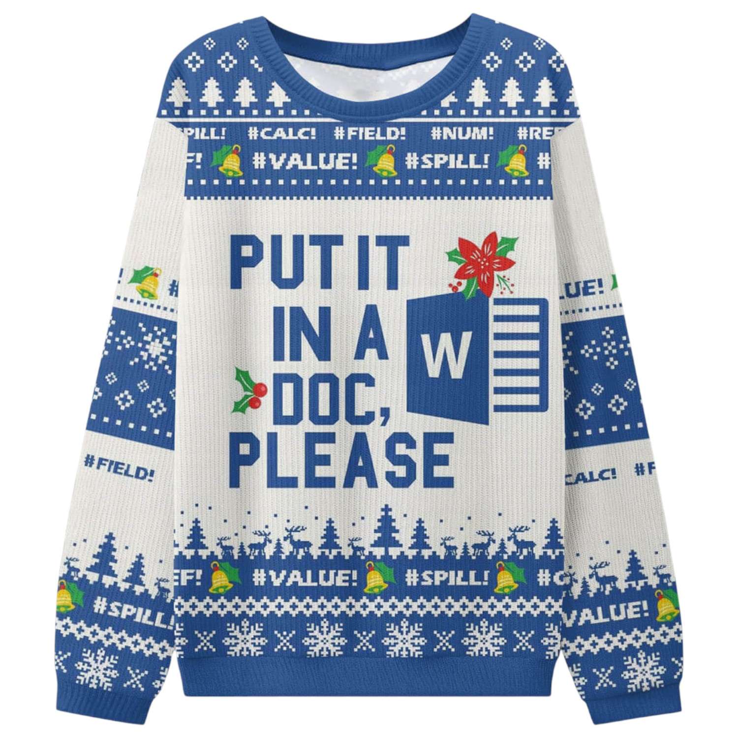 The front of the sweater is printed with the bold slogan PUT IT IN A DOC, PLEASE next to the familiar Word icon, a humorous message for anyone who has ever struggled with data files, spreadsheets or confusing emails. This is not only a funny ugly Christmas sweater, but also a manifesto for office workers, programmers, accountants or anyone who lives in the world of files and documents.