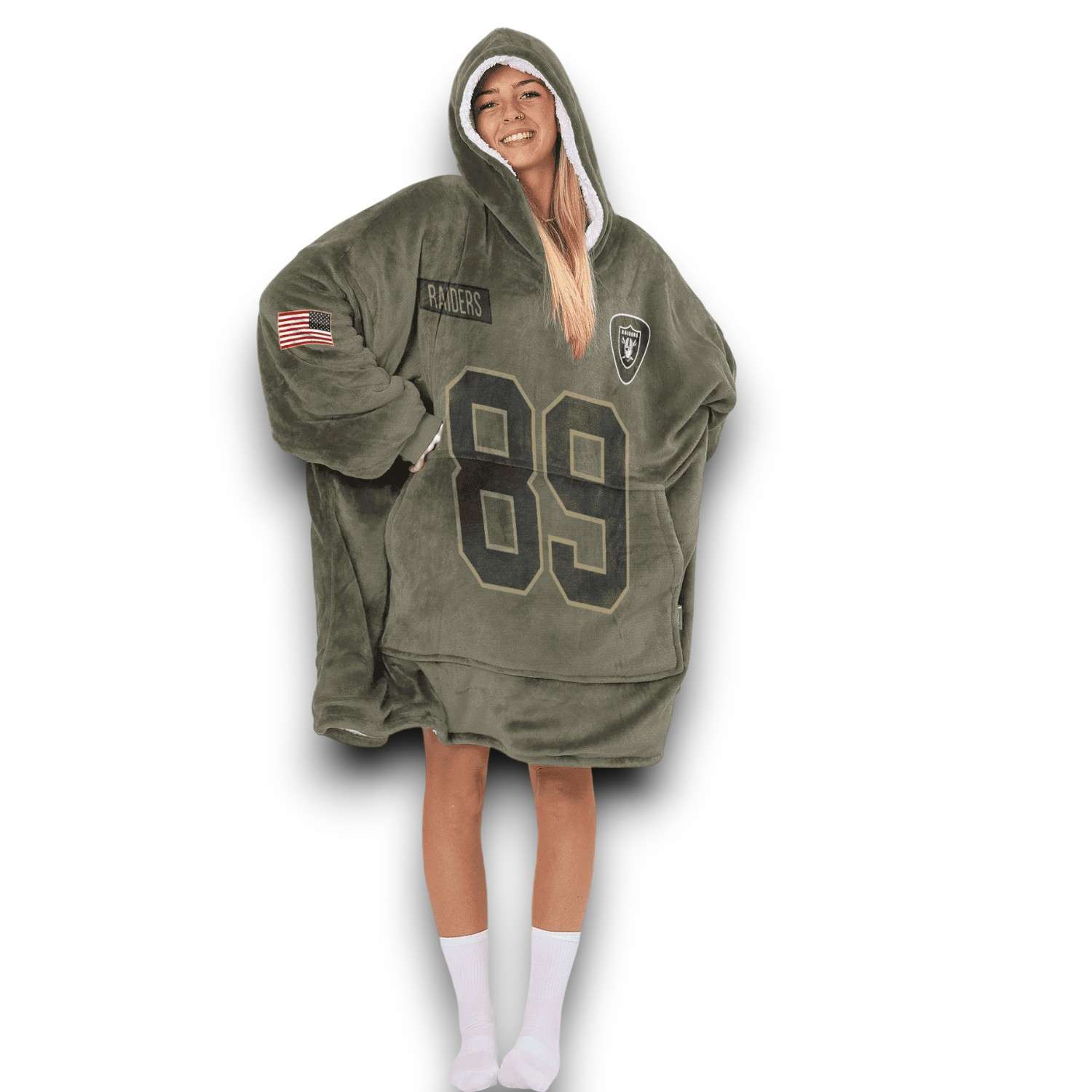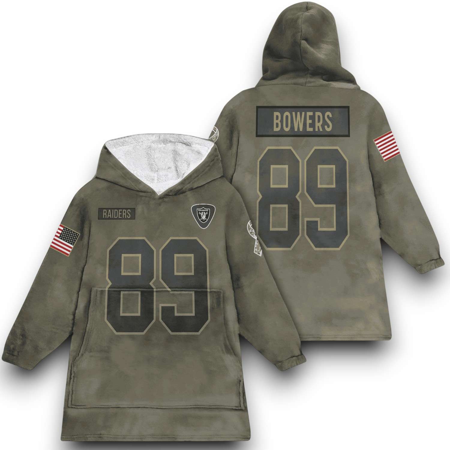 The Blanket Hoodie features a distinctive Olive color of military uniforms, part of a collection that honors the armed forces. The design mimics the Raiders jersey with the number 89 and the name Bowers on both the front and back, along with Raiders and subtle RAIDERS lettering. The important highlight is the solemn American flag, representing the spirit of Salute To Service. In terms of material, the shirt offers maximum warmth and luxury thanks to the super soft Acrylic inner layer: White Arctic Velvet (White Arctic Velvet), combined with the durable and heat-retaining 220g Polyester Double Flannel outer layer.