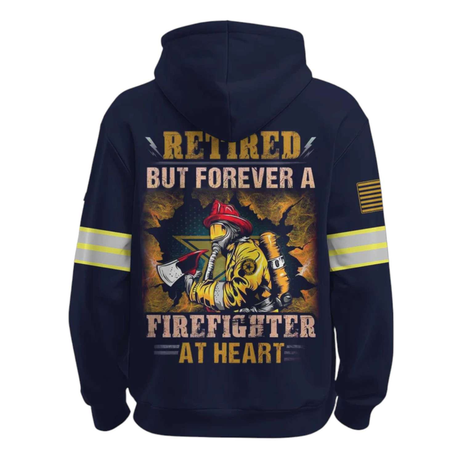 The front features the classic Raiders (majestic pirate head) transformed in gold, representing eternal value and respect. The back is the center of admiration: a brave Firefighter holding an axe, his face surrounded by smoke and debris, symbolizing the dangers he has overcome, framed in a heroic frame. Reflective yellow and gray horizontal stripes on the shoulders and sleeves mimic the ribbons on a firefighter’s uniform, along with an American flag emblem on the arm, complete the message of courage and service.