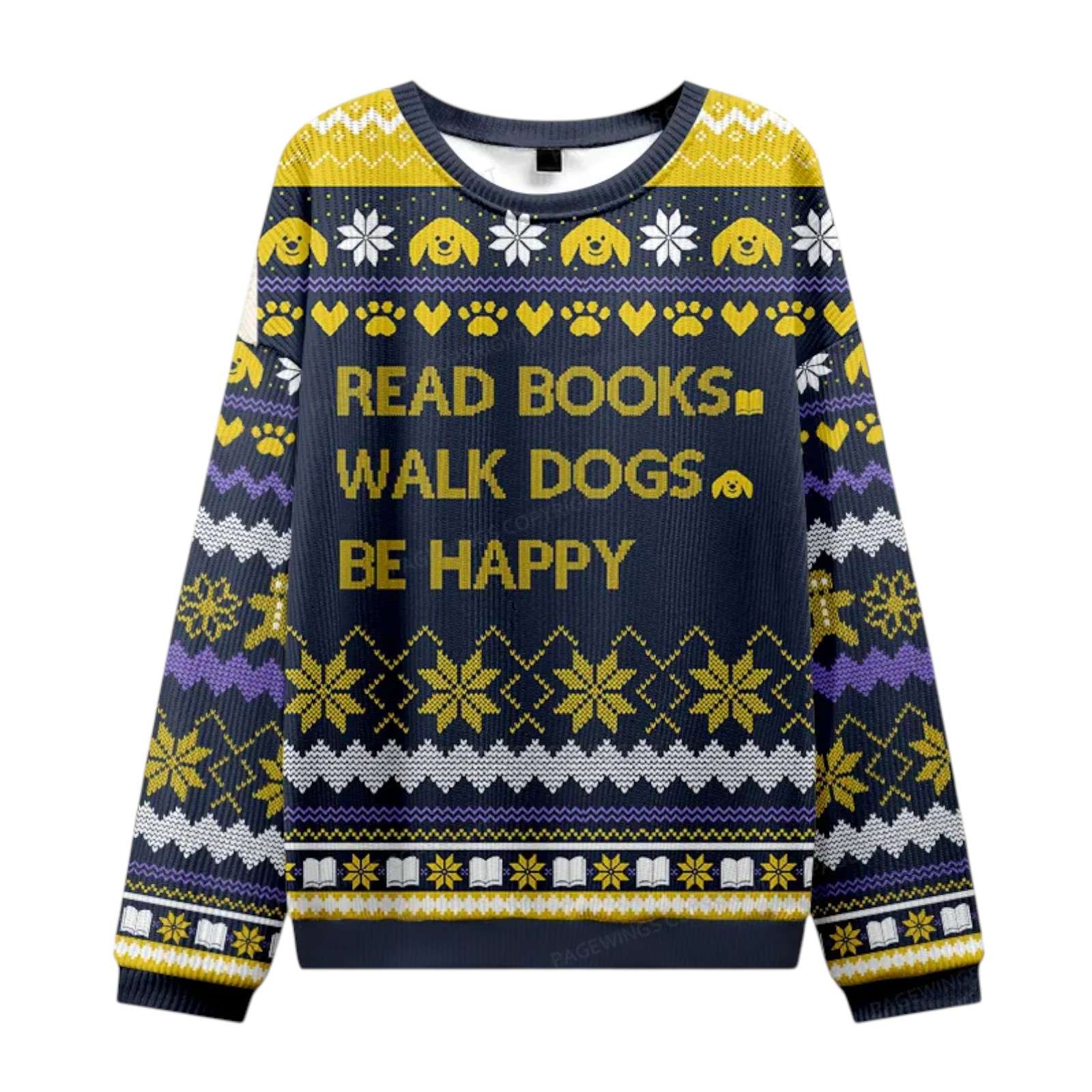 Read Books Walk Dogs Be Happy Christmas Ugly Sweater For Book And Dog Lovers