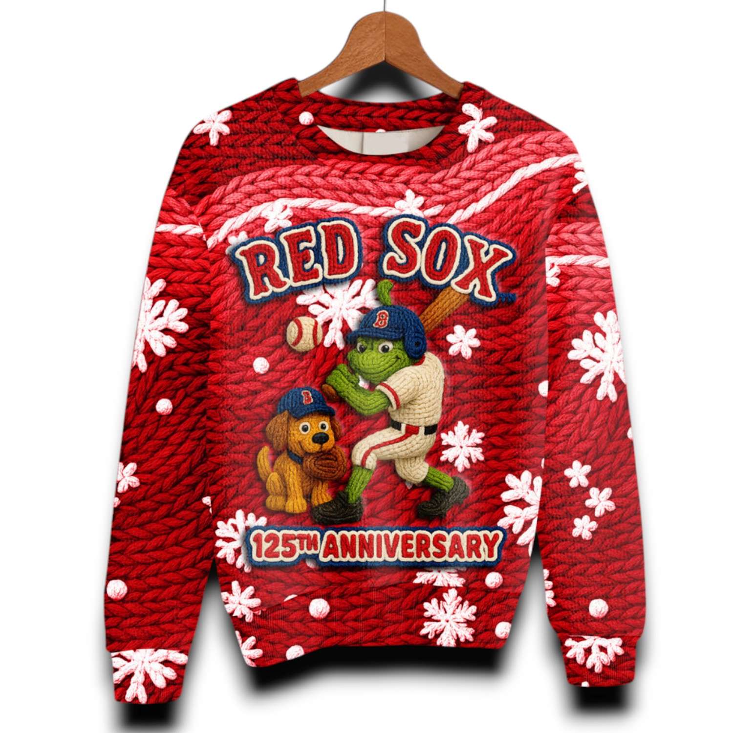 The sweater is a bold combination of Red Sox pride and Christmas spirit. The knitted red base features a snowy pattern. The front features a green Grnch and Max wearing a Red Sox cap, with the Grnch in a batting pose, complete with RED SOX and the words 125TH ANNIVERSARY. The back features the Grnch holding a batting bauble emblazoned with the classic Red Sox. This is a unique, warm, and humorous shirt, perfect for the die-hard fan who wants to be the life of every holiday party.