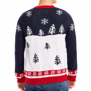 The greeting “Merry Christmas” is familiar, but when expressed in a unique and humorous way on this sweater, it becomes extremely interesting. The image of Santa Claus “going to pee yellow” creates a surprising, funny effect and makes viewers unable to take their eyes off. The sweater is designed with the main colors of blue, black, red and white, creating a harmonious and eye-catching whole. Besides the unique image of Santa Claus, the sweater is also decorated with scattered snowflakes and Christmas trees, bringing a strong Christmas atmosphere.
