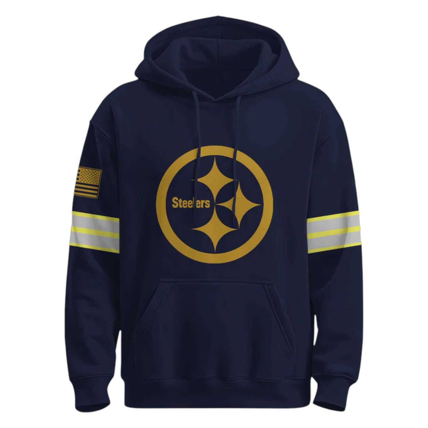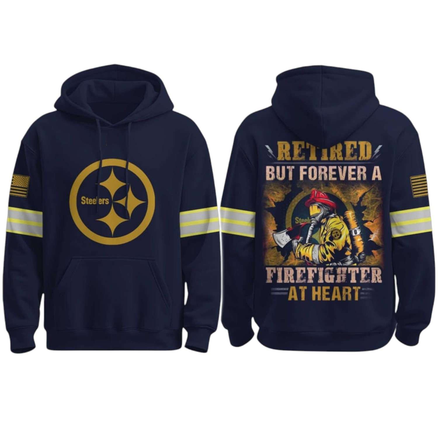 The front of the hoodie features the legendary Steelers sitting solemnly on a dark navy blue background, affirming the pride of the sport. However, the soul of the shirt lies in the message Retired But Forever A Firefighter At Heart – a slogan that is both simple and profound, as an affirmation: retirement is just a state of work, never the end of the mission and passion for service. The graphic on the back is a dramatic blend of a firefighter’s helmet and a glowing yellow flame that envelops the team emblem, making a powerful statement of courage, unity, and the never-ending fighting spirit of a hero.