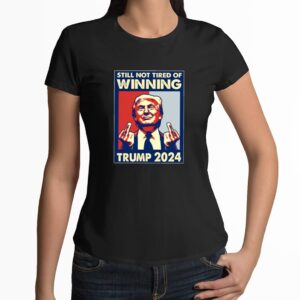 With the bold slogan “Not Tired of Winning” prominently displayed, this T-shirt captures Trump’s relentless pursuit of success and the unwavering support of his followers. The design is both powerful and patriotic, representing the resilience and determination that defines the American spirit.